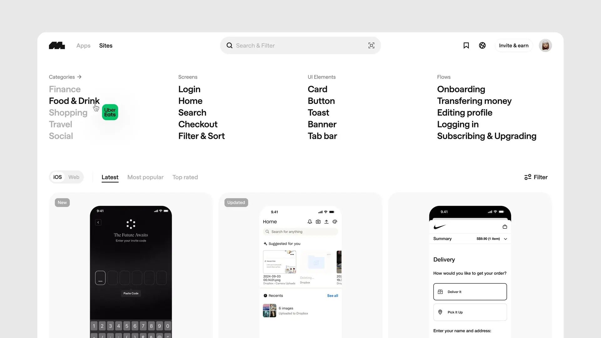 Mobbin is a massive library of real product screenshots and full flows from top apps. Search by platform, pattern, component, or category to find what actually works in the wild.
